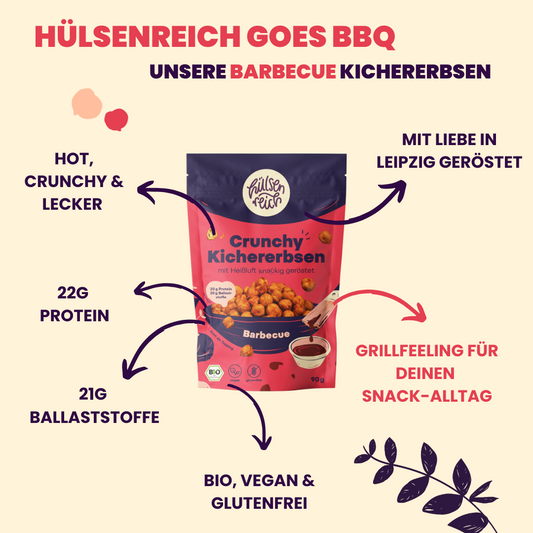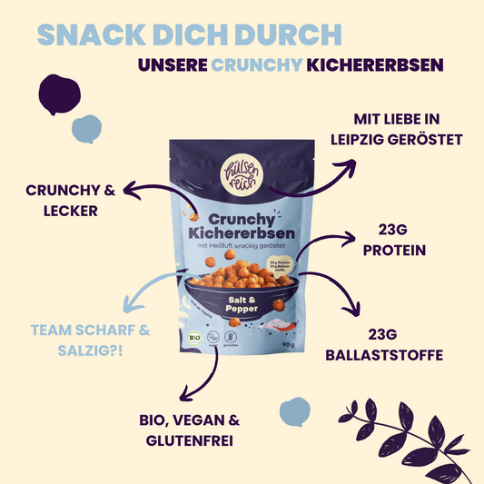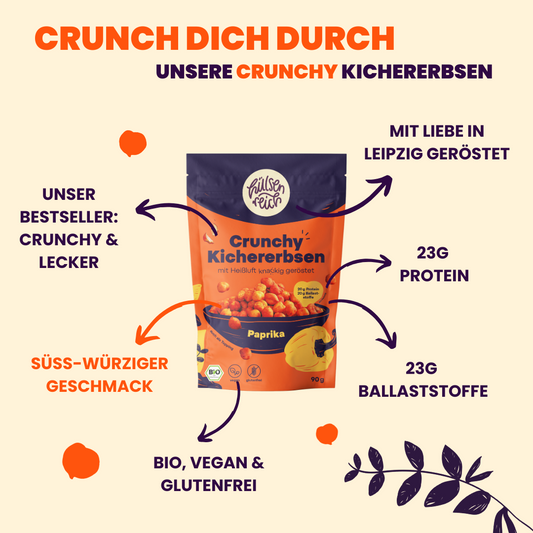 Mit unserem Heißluft-Rösterverfahren verleihen wir unseren Kichererbsensnacks eine unvergleichliche Knusprigkeit und bewahren gleichzeitig die wertvollen Nährstoffe der Kichererbsen.